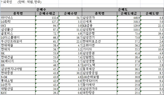 반면 하이닉스(132억원)와 LG화학(127억원), OCI(94억원), 삼성물산(87억원), 글로비스(72억원) 등을 순매수했다. 하이닉스는 반도체 업황 회복에 따른 실적개선 기대감에 외국인의 매수세가 유입되면서 1.25% 상승했다.