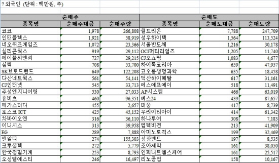 업종별로는 IT종합, IT H/W, IT S/W, IT부품 등은 사들인 반면 제약, 제조, 운송부품 등은 팔아치웠다.