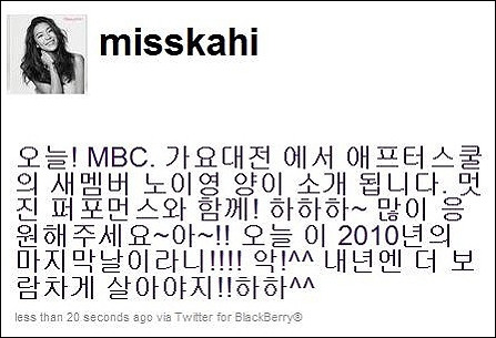 애프터스쿨 리더 가희는 31일 자신의 트위터에 “오늘 MBC 가요대제전에서 애프터스쿨의 새 멤버 노이영 양이 소개됩니다. 멋진 퍼포먼스와 함께..”라고 소개했다.