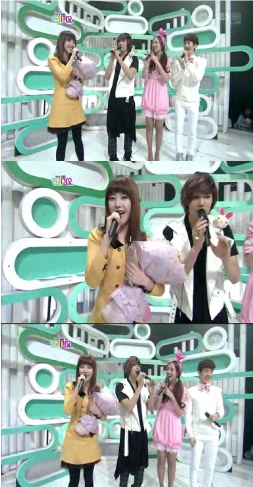 MC 이홍기가 “아이유 앓이를 하고 계신 분들을 위해서 3단 애교를 준비했다고 들었는데 한번 보여 달라”고 부탁하자 아이유는 자신의 노래 ‘좋은날’의 하이라이트인 “나는요 오빠가 좋은걸”을 깜찍한 안무와 함께 발랄하게 선보였다.