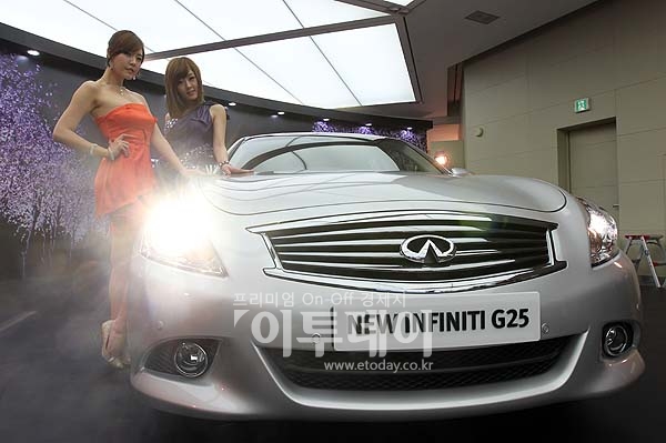 글로벌 럭셔리 브랜드 인피니티가 10일 오전 SS모터스 강남전시장에서 자사 최초 배기량 3,000cc 이하 모델인 NEW INFINITI G25 출시 행사를 가지고 있다.NEW INFINITI G25에는 최고출력 221마력, 최대토크 25.8/4,800(kg.m/rpm)의 2.5리터 V6 VQ25HR 엔진이 탑재됐다. 공인연비는 11.0Km/L, 판매가격은 43,900,000 이다.