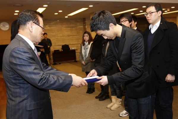 ▲권홍사 회장(왼쪽)이 장학금 수혜자 대표인 박정환씨(서울대 건축학과)에게 장학금 300만원과 장학증서를 전달하고 있다.