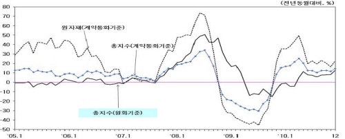 이와 반대로 연간 수출물가 상승률은 환율 하락의 영향을 더 많이 받아 2009년 -0.2%에서 지난해 -2.6%로 하락 폭이 커졌다.
