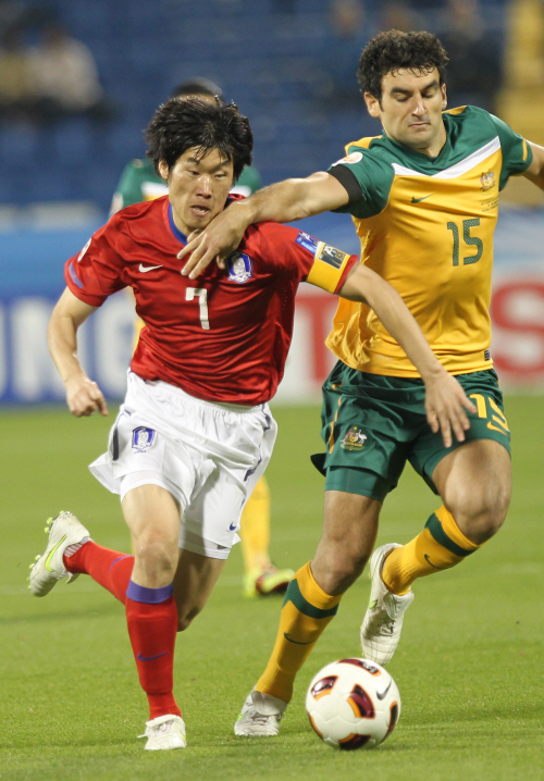 박지성(맨체스터 유나이티드)이 14일 오후(한국시간) 카타르 알 가라파 스타디움에서 열린 아시안컵 C조 2차전 한국 대 호주 경기에서 마일 제디낙의 수비를 피해 돌파를 시도하고 있다. 2011.1.14