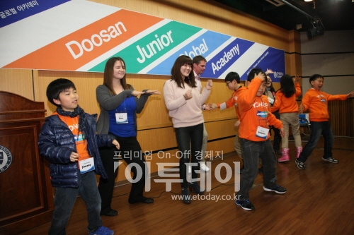 ▲두산중공업 해외 건설 현장 임직원의 가족들이 패밀리두 프로그램 중 하나로 연세어학당에서 열리고 있는 영어캠프 ‘두산 주니어 글로벌 아카데미’에서 영어도 배우며 즐거운 시간을 갖고 있다.(사진제공=두산중공업)