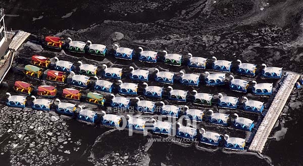 서울 아침기온이 영하 16도까지 떨어진 17일 오전 연일 계속되는 한파에 한강이 얼어붙어 오리배들의 발이 묶여 있다.