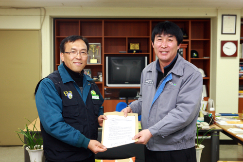 ▲현대오일뱅크 김태경 노조위원장(사진 오른쪽)이 현대중공업 오종쇄 노조위원장(왼쪽)을 찾아 설 선물 등 각종 기념품으로 오일뱅크 상품권을 사용해 달라는 협조 공문을 전달하고 있다.(제공=현대오일뱅크)