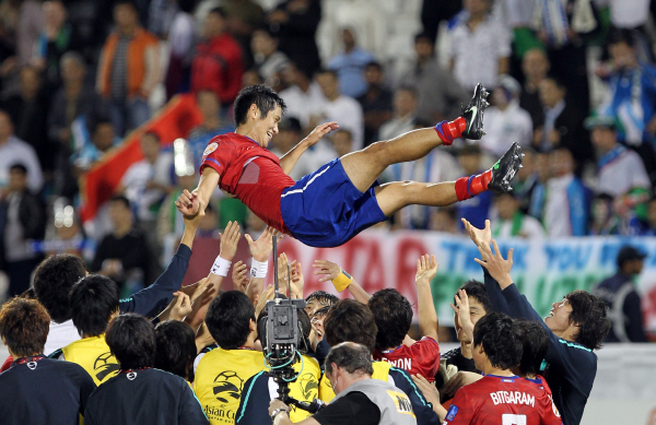 이영표가 국가대표팀 은퇴 의사를 밝힌 가운데 29일 오전(한국시간) 카타르 도하 알 사드 스타디움에서 열린 아시안컵 3.4위전 한국 대 우즈베키스탄 경기에서 선수들이 헹가래치며 이영표의 명예로운 은퇴를 축하하고 있다.