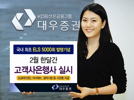 대우증권은 국내 최초 주가연계증권(ELS) 5000회 발행을 기념해 오는 24일까지 ELS 및 기타파생결합증권(DLS) 청약고객을 대상으로 고객사은행사를 실시한다.