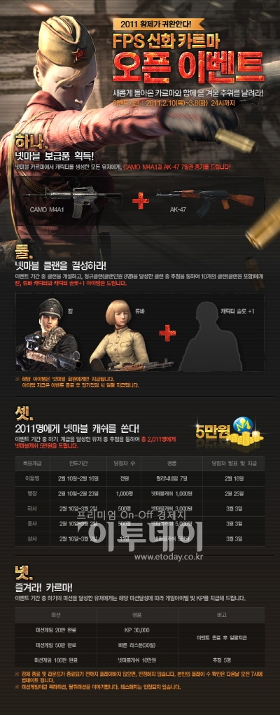한편 드래곤플라이는 이번 채널링 서비스를 기념해 금일부터 3월8일까지 오픈 기념 이벤트를 실시한다. 넷마블의 게임색션을 통해 카르마에 접속하면 ‘M4A1’, ‘AK-47’ 기간제 총기 아이템을 지급하며 이벤트 기간 동안 넷마블 내에 클랜원 8명 이상의 정규클랜을 운영하고 병장 계급 이상을 달성한 게이머를 대상으로 ‘칼 되니츠’, ‘류바 마키노바’ 등 인기 게임 캐릭터와 넷마블 캐쉬 총 600만원을 지급하는 등 푸짐한 혜택을 제공한다.