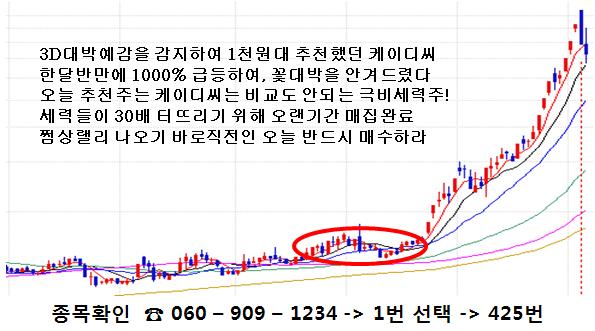 아무리 늦어도 내일부터는 불꽃랠리가 펼쳐질 것으로 예상되는데 지금 서두르지 않으면 원하는 만큼 물량을 잡지 못할 수도 있다. 주식투자로 팔자를 유일하게 고치는 법은 바로 이 종목이 될 것임을 반드시 명심하길 바라겠다.