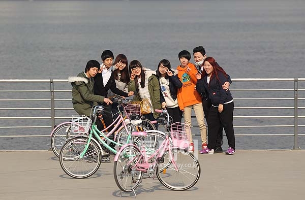 전국에 따뜻하고 화창한 봄 날씨가 계속되고 있는 22일 오후 여의도 한강시민공원을 찾은 학생들이 친구들과 기념사진을 촬영하며 추억을 남기고 있다.