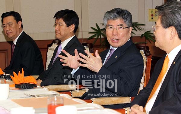 김중수 한국은행 총재(오른쪽 두번째)가 23일 오전 소공동 한국은행에서 열린 금융협의회에서 시중은행장들과 환담하고 있다.