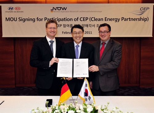 현대ㆍ기아차는 25일 경기도 화성 롤링힐스에서 이현순 현대ㆍ기아차 연구개발총괄본부 부회장, 클라우스 본호프 독일 NOW 대표, 파트릭 슈넬 독일 클린 에너지 파트너십(CEP) 의장, 베르트 드 콜베나르 유럽연합 수소연료전지사업(FCH-JU) 총괄책임자 등이 참석한 가운데 '클린 에너지 파트너십 참여에 관한 양해각서(MOU)'를 체결했다.