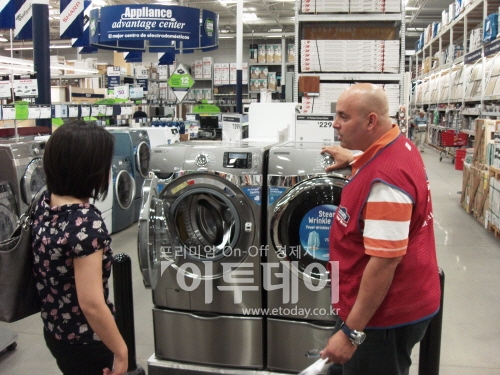 ▲미국 현지 LOWES 매장에서 직원이 매장을 찾은 고객에게 프리미엄 드럼세탁기 제품을 소개하고 있다.(삼성전자)
