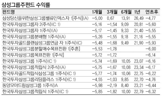 10일 금융정보업체 에프앤가이드에 따르면 8일 현재 상장지수펀드(ETF)를 제외한 13개 삼성그룹주펀드의 1개월 평균수익률은 -5.45%를 기록하고 있다. 같은기간 국내주식형 펀드 -4.38% 보다 1%포인트 이상 하회하고 있는 것이다.