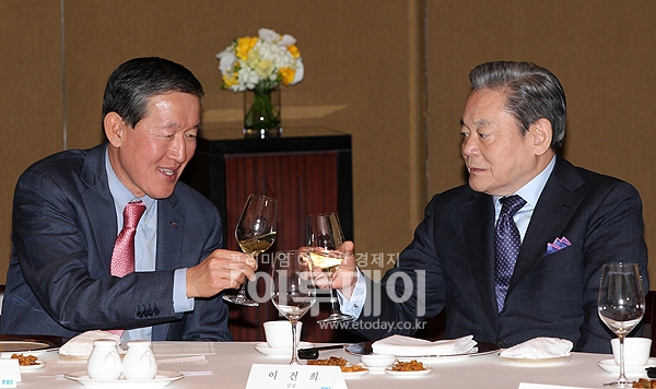 허창수 전경련 회장(사진 왼쪽)과 삼성 이건희 회장이 10일 오후 서울 용산구 한남동 하얏트호텔에서 열린 전경련 회장단회의에 참석해 건배를 하고 있다.