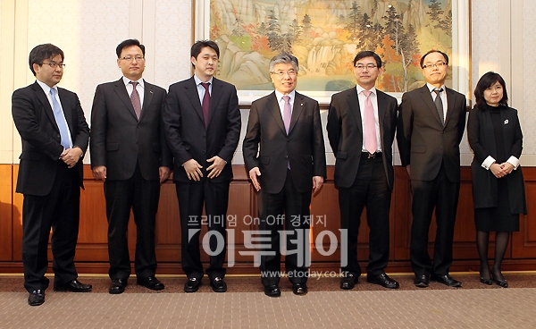 김중수 한국은행 총재가 11일 오전 서울 소공동 한국은행에서 개최한 ‘투자은행 전문가들과 간담회’에 참석해 참석자들과 기념촬영을 하고 있다.