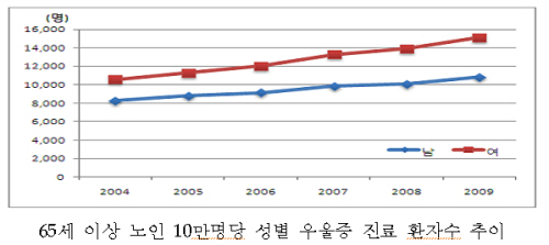 또 2009년을 기준으로 성별 우울증 환자수를 비교하면 여성이 10만4000명으로 남성(4만3000명)에 비해 배 이상 많았다.