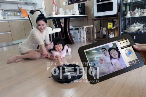 ▲삼성전자 탱고뷰 로봇청소기가 실내에 있는 주부와 아이의 모습을 PC와 갤럭시탭에서 실시간으로 보여주고 있다.(삼성전자)