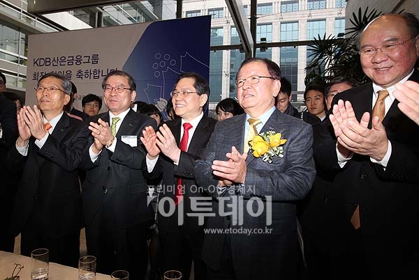 강만수 신임 산은금융지주 회장(오른쪽 두번째)이 14일 오후 여의도 산업은행 본점에서 진행된 취임식에 참석해 참석자들과 박수를 치며 축하를 나누고 있다.