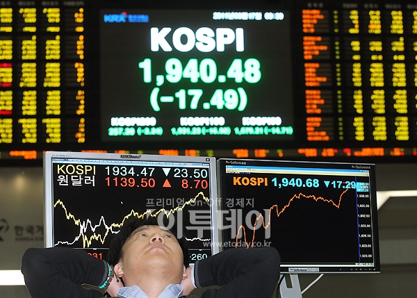 코스피지수가 일본 원자력 발전소 폭발의 불안감으로 하루만에 급락했다. 17일 오전 서울 여의도 한국거래소에서 코스피 지수가 전일 대비 17포인트 하락한 1940선대에 거래되고 있다.