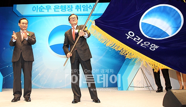 이순우 신임 우리은행장(오른쪽)이 24일 오전 서울 중구 회현동 우리은행 본점에서 열린 취임식에 참석해 은행기를 흔들고 있다.