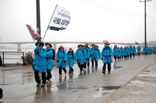 ▲대우증권 신입사원 국토대장정 참가자들이 마지막 구간인 '강화도-여의도' 봄비를 맞으며 행군하고 있다.