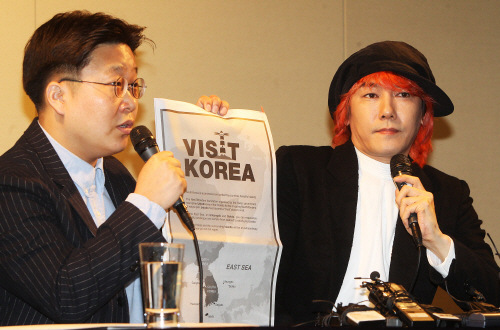 가수 김장훈(오른쪽)과 서경덕 교수가 30일 오전 서울 영등포구 여의도 63빌딩에서 일본의 독도 영유권 주장을 담은 중등 교과서 검정에 대한 자신의 입장을 밝히는 기자회견을 하고 있다.