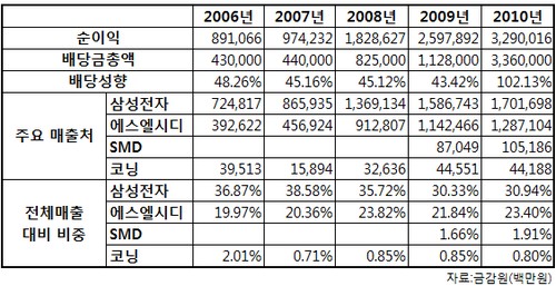 2006년 4300억원(이하 배당성향 48.26%)을 비롯해 2007년 4400억원(45.16%), 2008년 8250억원(45.12%)을 배당했다. 2009년에는 1조1280억원(43.42%)의 배당금을 지급해 배당금 1조원 시대를 열었다. 최근 5년간의 배당금 총액은 6조1830억원으로 최대주주인 미국 코닝사는 3조원 이상의 배당금을 챙겼다.