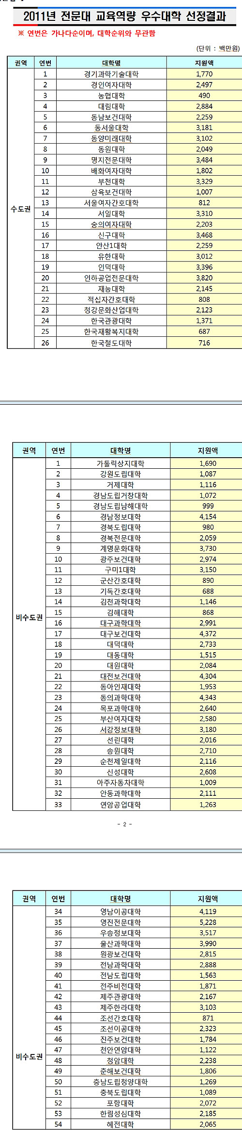 교육과학기술부(장관 이주호)는 7일 2011년도 전문대학 교육역량 강화사업을 위한 국고 재정지원 대상대학 선정결과를 확정․발표하고 교육역량 우수대학으로 146개 전문대학 중 교육여건과 성과가 우수한 전문대학 80개를 선정하고 대학당 평균 32억원의 예산을 지원한다고 밝혔다.