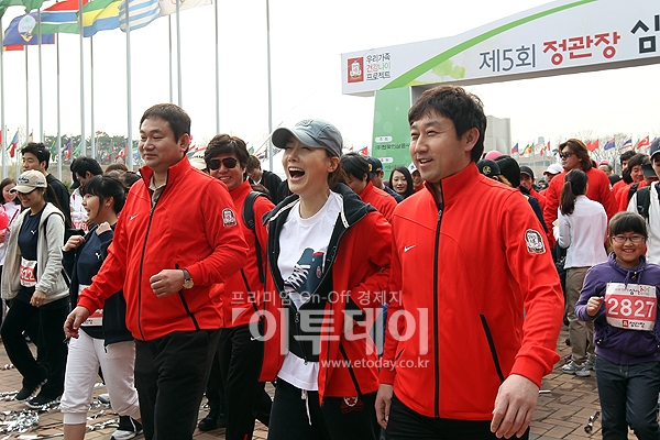 배우 김혜진, 배도환, 김현욱 아나운서가 10일 오전 서울 방이동 올림픽공원 평화의광장에서 열린‘제5회 정관장 심나는 걷기대회’에서 출발신호와 함께 즐겁게 걸음을 내딪고 있다.
