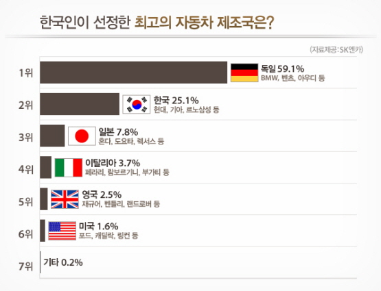 그 결과 BMW, 벤츠, 아우디 등 수입차업체가 집중돼 있는 독일이 59.1%로 1위를 차지했다. 대부분의 응답자들은 독일차의 디자인과 성능, 안전성을 주요인으로 꼽았다.