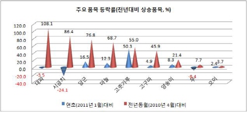 뿐만 아니라 고구마(45.9%), 당근(76.8%), 마늘(68.7%), 시금치(86.4%) 등도 큰 폭의 오름세를 보였다.