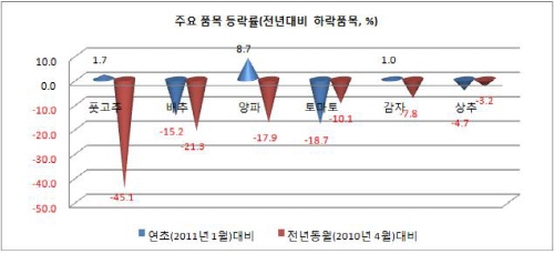 반면 풋고추는 kg 기준으로 1만575원에 거래되면서 전년동월대비 45.1% 하락했고, 배추 21.3%, 양파 17.9% 하락했다.