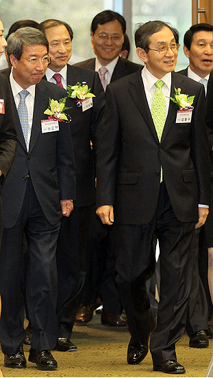정운찬 동반성장위 위원장(왼쪽)과 김동수 공정위 위원장이 18일 오전 서울 서초동 R&D 캠퍼스에서 열린 ‘LG 공정거래 및 동반성장 협약식’에 참석하고 있다.