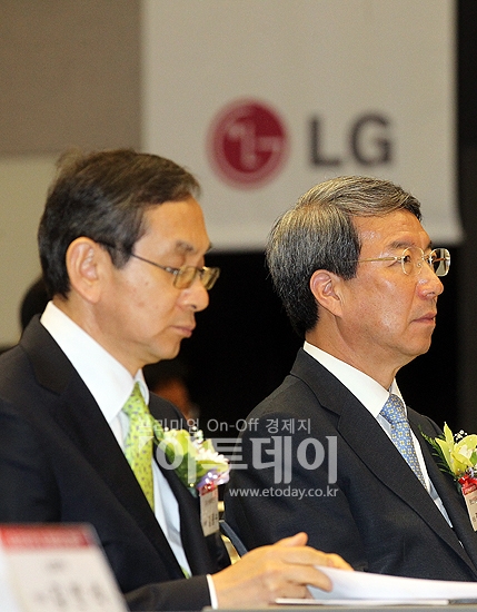 정운찬 동반성장위 위원장(오른쪽)과 김동수 공정위 위원장이 18일 오전 서울 서초동 R&D 캠퍼스에서 열린 ‘LG 공정거래 및 동반성장 협약식’에 참석해 환영사를 듣고 있다.