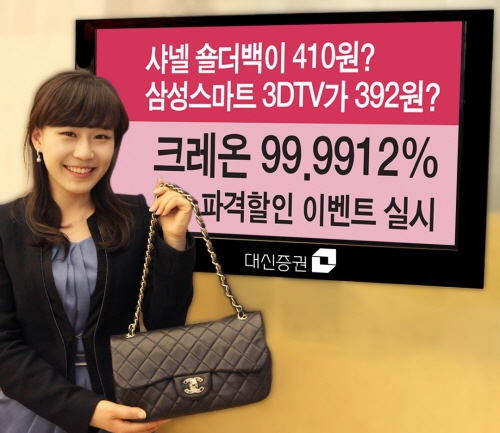이번 은행연계 주식거래 서비스인 크레온의 저가 수수료를 알리기 위해 마련됐다. 샤넬 숄더백이 410원, 삼성 스마트 3D TV가 392원, 까르띠에 손목시계가 245원, 프라다가방이 193원, LG트롬 스타일러가 186원, 미즈노 아이언 골프채가 152원, 애플의 맥북 에어가 149원에 제공되는 등 총 25개 아이템 2441개 상품이 준비됐다.
