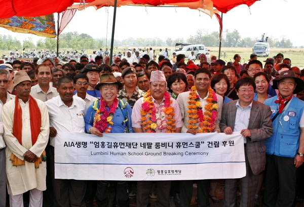 AIA생명은 엄홍길휴먼재단이 제3차 휴먼스쿨로 선정한 네팔 룸비니 지역의 쉬리 싯타르타 거떰 부따 초등학교 신축 및 학습기자재 마련을 위해 3000만원의 건립 기금을 후원한다.