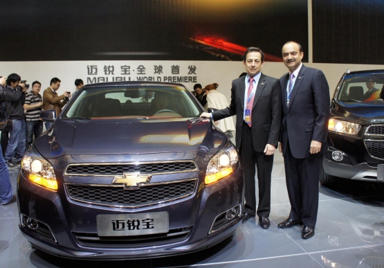 제너럴 모터스(GM)는 19일 개막한 2011 상하이모터쇼에 쉐보레 브랜드의 차세대 중형차 말리부(Malibu)를 세계 최초로 공개했다. 글로벌 GM의 첨단 차체설계기술을 바탕으로 4기통 에코텍 엔진과 6단 자동변속기를 장착한 말리부는 올 하반기 국내시장에 출시될 계획이다. 한국GM 마이크 아카몬(Mike Arcamone) 사장(사진 왼쪽)과 판매A/S마케팅 안쿠시 오로라(Ankush Aurora) 부사장(사진 오른쪽)이 쉐보레 말리부와 기념 촬영을 하고 있다.