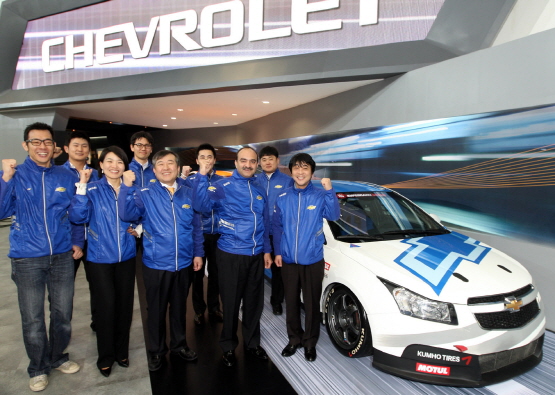 ▲한국GM은 20일, 쉐보레 레이싱팀 시즌발대식을 갖고 24일 본격 개막하는 2011 티빙 슈퍼레이스 챔피언십에 크루즈 1.8 가솔린터보 레이싱카를 출전시킨다. (사진 앞줄 오른쪽부터 이재우 감독 겸 선수, 판매A/S마케팅 안쿠시 오로라(Ankush Arora) 부사장, 국내영업마케팅본부 김성기 전무, 마케팅커뮤니케이션 이경애 상무, 김진표 선수)