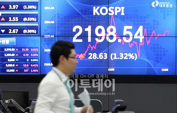 연일 상승세를 보인 코스피지수가 21일 또 다시 사상 최고치를 기록하며 2,198.54로 마감했다. 이날 오후 여의도 대우증권 트레이딩센터 직원들이 바쁘게 업무를 보고 있다.