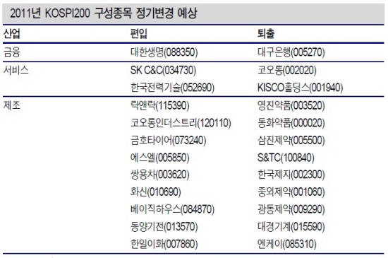 선정된 종목은 대한생명, SK C&C, 한국전력기술, 락앤락, 코오롱인더스트리, 금호타이어, 에스엘, 쌍용차, 화신, 베이직하우스, 동양기전, 한일이화 등이다. 퇴출 예상종목은 대구은행, 코오롱, KISCO홀딩스, 영진약품, 동화약품, 삼진제약, S&TC, 한국제지, 중외제약, 광동제약, 대경기계, 엔케이 등이 꼽혔다.
