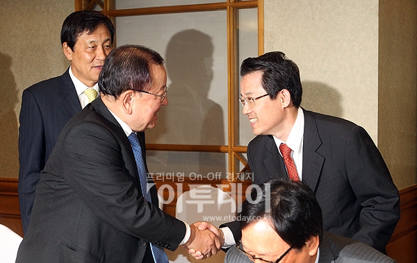 권혁세 금융감독원장(오른쪽)이 26일 오전 서울 소공동 은행회관에서 열린 은행장 조찬모임에 참석해 강만수 산업은행장과 악수를 나누고 있다.