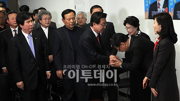 4.27 재보선 한나라당 강재섭 후보가 27일 밤 경기도 성남시 분당구 정자동 선거캠프에서 패배를 선언하는 기자회견을 마치고 지지자들과 악수를 나누고 있다.