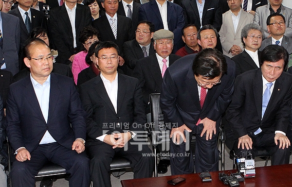 4.27 재보선 한나라당 강재섭 후보가 27일 밤 경기도 성남시 분당구 정자동 선거캠프에서 패배를 선언하는 기자회견을 마치고 고개숙여 인사를 하고 있다.