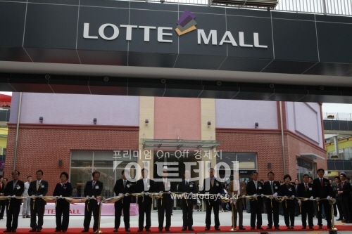 테이프 커팅식에는 이철우 롯데백화점 대표이사(왼쪽에서 8번째)를 중심으로 김버일 대구시장(좌측) , 정동화 포스코건설 사장(우측)이 참석했다.