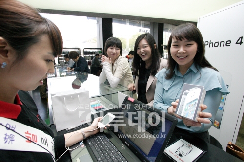 ▲28일 서울 종로구 KT 올레스퀘어에서 김민주(24세, 독산동)씨가 아이폰4 화이트 모델을 1호로 개통하고 있다. 가장 우측이 김민주 씨.