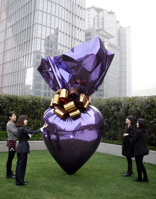 보라색 포장에 금색 리본이 묶여진 반짝이는 하트 모양으로 높이는 3.7미터, 무게는 1.7톤에 이르는 초대형 스테인리스 스틸 작품이며, 작품 추정가는 300억원에 이른다.