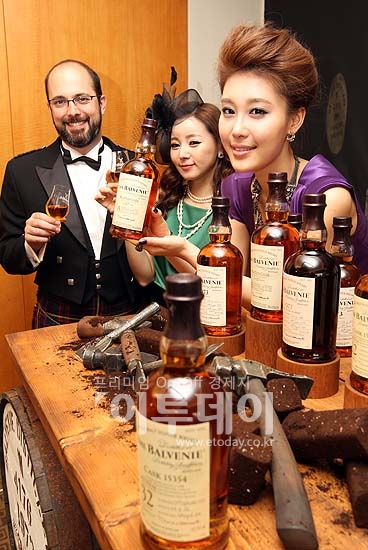 수제 명품 싱글몰트 위스키 발베니(The Balvenie)가 3일 오전 소공동 롯데호텔에서 ‘발베니 피티드 캐스크 17년 한정판’과 빈티지 발베니 1973, 1975, 1973 쉐리 캐스크 등 총 4종을 출시, 글로벌 홍보대사 샘 시몬스(왼쪽)와 모델들이 위스키를 소개하고 있다. ‘발베니 피티드 캐스크 17년’은 위스키의 신 데이비드 스튜어트가 선택한 오크통에서 소량 출시되는 한정판으로 국내는 120병만 판매된다. 발베니는 보리재배부 전 과정이 수작업으로 이워지는 것으로 유명하며 동급 위스키 중 가장 가격대가 높다.